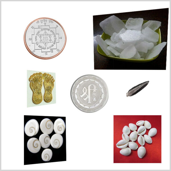 The Kuber Pooja Set includes Kuber Idol, Orthoceras Stone Pendant, Original Bhimseni Kapoor, 11 White Kaudi, 11 Gomti Chakra, Kuber Paduka, 2.5 Silver Lagdi. Having all these items in the Yantra makes it a Maha Yantra, a complete set of Yantra to provide the devotee with positive waves of spiritual energy.