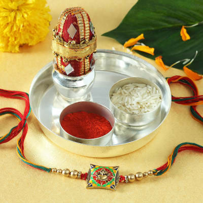 The online puja rituals start with the sister putting the tilak on the brother’s forehead with some Akshat (white rice), and rotates the Aarti Thali (tray with lighted lamp/ diya) around the brother’s face while praying for his prosperity and happiness.